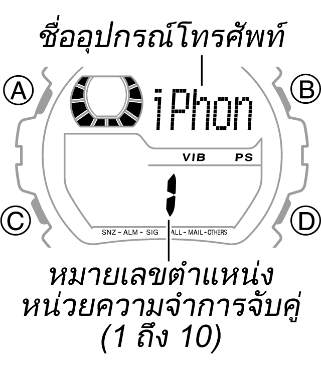 - ซึ่งจะแสดงหมายเลขตำแหน่งหน่วยความจำการจับคู่ของโทรศัพท์ที่เชื่อมต่อกับนาฬิกาล่าสุด