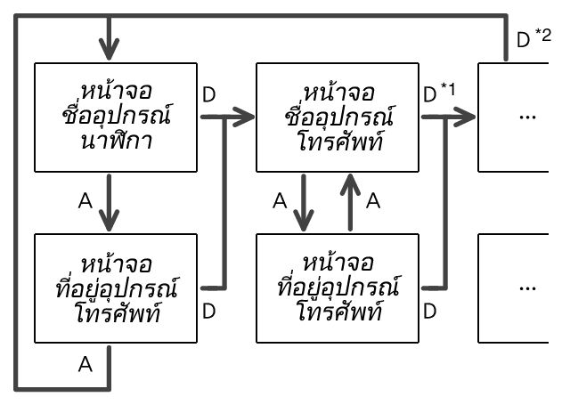 *2 การกดปุ่ม D หลังจากแสดงหน้าจอชื่ออุปกรณ์ของโทรศัพท์ที่จับคู่ทั้งหมด จะเป็นการกลับไปที่หน้าจอชื่ออุปกรณ์นาฬิกา