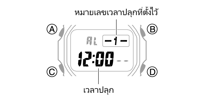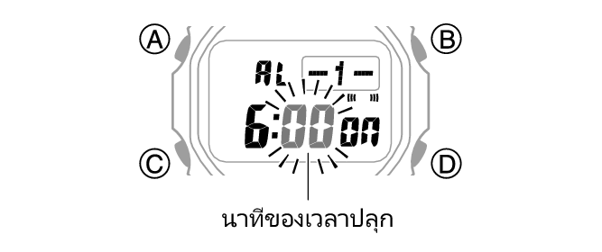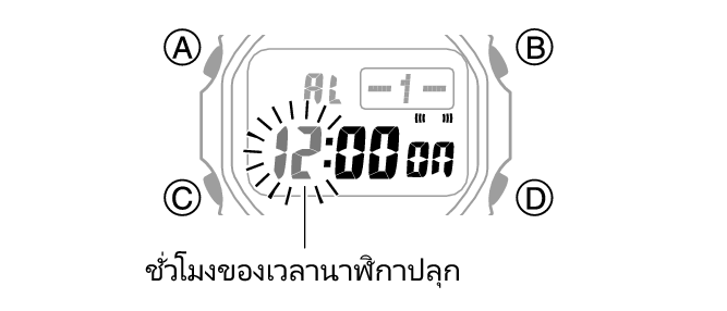 ในโหมดตั้งเวลาปลุก ให้กด (D) เพื่อส่งเสียงนาฬิกาปลุก