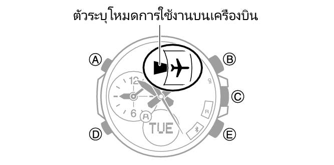 - แต่ละครั้งที่กดปุ่ม (D) ค้างไว้ประมาณห้าวินาที นาฬิกาจะเข้าสู่หรือออกจากโหมดเครื่องบิน