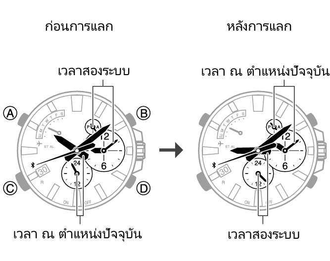 การสลับการตั้งค่าระหว่างเวลา ณ ตำแหน่งปัจจุบันและเวลาสองระบบ คุณสามารถสลับเวลาของตำแหน่งปัจจุบันของคุณกับเวลาสองระบบได้โดยการกด (B) ค้างไว้ประมาณสามวินาที