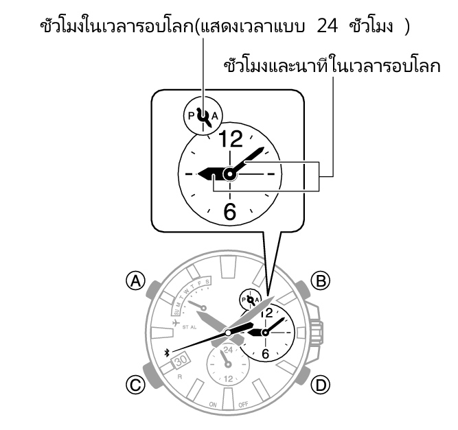 - ในโหมดปฏิทิน คุณสามารถตรวจสอบเวลารอบโลก โดยดูที่เข็มชั่วโมงสั้นและเข็มนาทีได้