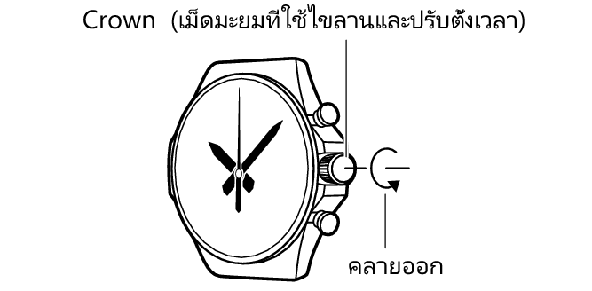 ก่อนใช้งาน Crown (เม็ดมะยมที่ใช้ไขลานและปรับตั้งเวลา) คุณจำเป็นต้องดึง Crown (เม็ดมะยมที่ใช้ไขลานและปรับตั้งเวลา) ออก 1 หรือ 2 จังหวะก่อน อย่าดึง Crown (เม็ดมะยมที่ใช้ไขลานและปรับตั้งเวลา) แรงเกินไป