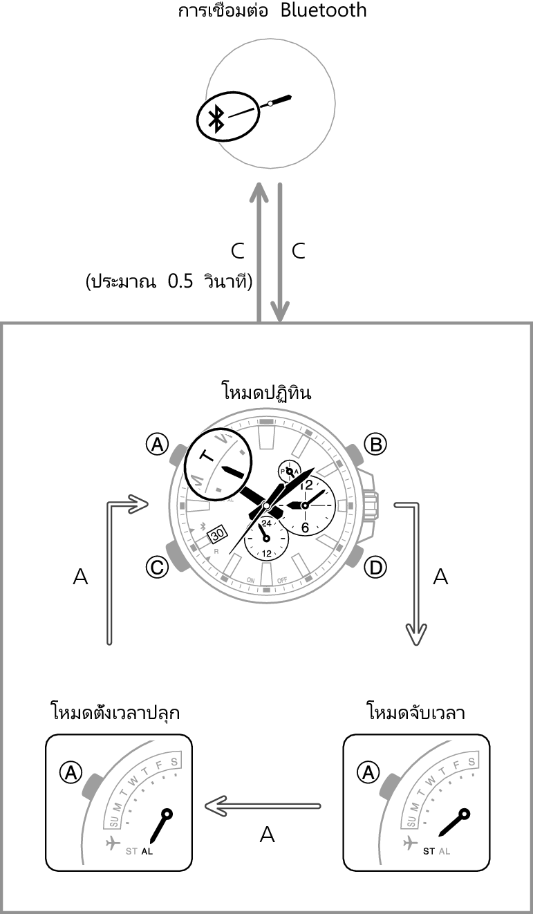 ใช้ (A) เพื่อไปยังโหมดต่างๆ กด (A) ค้างไว้ประมาณสองวินาทีเพื่อเข้าสู่โหมดปฏิทิน กด (C) ค้างไว้ประมาณ 0.5 วินาทีเพื่อเชื่อมต่อกับโทรศัพท์