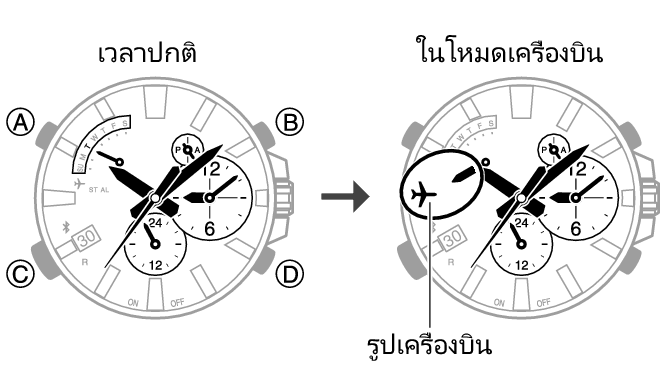 เมื่ออยู่ในโรงพยาบาล ในเครื่องบิน หรือในพื้นที่อื่นๆ ที่ไม่อนุญาตให้ใช้คลื่นวิทยุ ให้กดปุ่ม (A) ของนาฬิกาค้างไว้ประมาณ 4 วินาทีเพื่อเข้าสู่โหมดเครื่องบิน