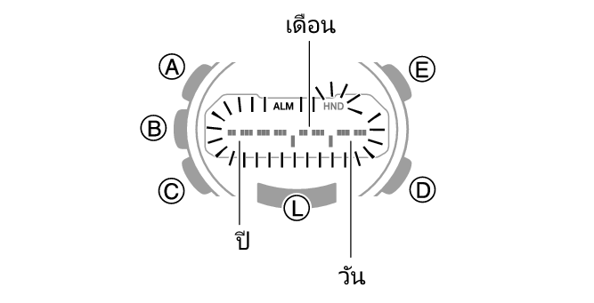 - (C): ใช้ปุ่มนี้เพื่อเลื่อนการกะพริบระหว่างหลักปี เดือน และวัน