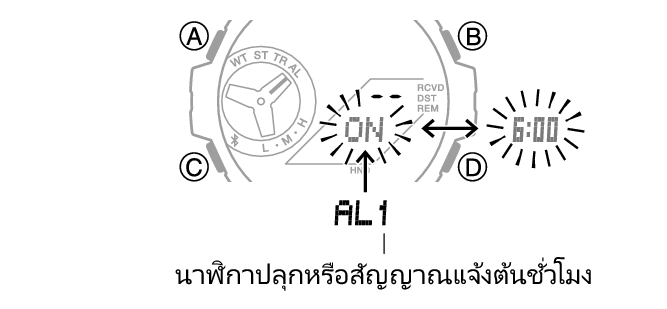 ใช้ (D) เพื่อเลื่อนไปตามเวลาปลุก ([AL1] ถึง [AL5]) และหน้าจอสัญญาณแจ้งต้นชั่วโมง ([SIG]) จนกว่ารายการที่คุณต้องการปิดจะปรากฏ