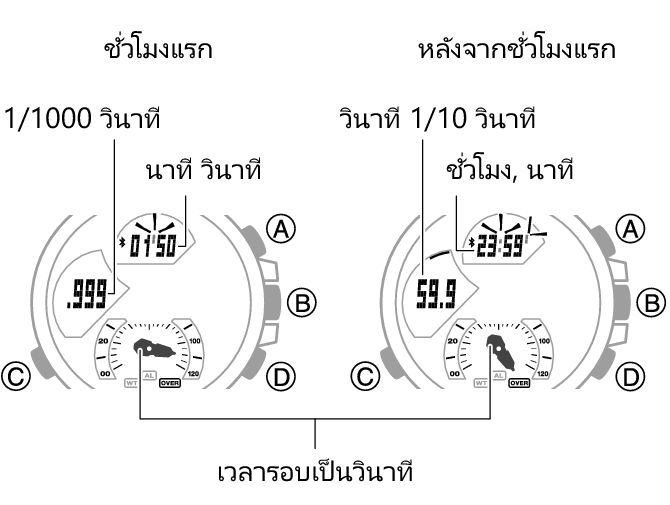 กด (B) แต่ละครั้งเพื่อแสดงเวลาที่ผ่านไปนับจนถึงปัจจุบัน (เวลารอบ) นับตั้งแต่เริ่มการจับเวลารอบสุดท้าย ซึ่งจะแสดงผลครั้งละ 8 วินาที