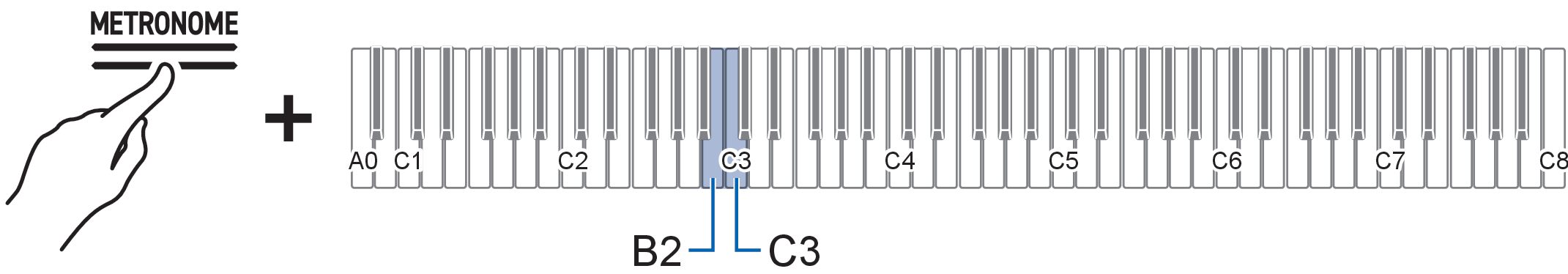 “METRONOME” düğmesini basılı tutarken B2 tuşuna (tempo –)/C3 tuşuna (tempo +) basın.