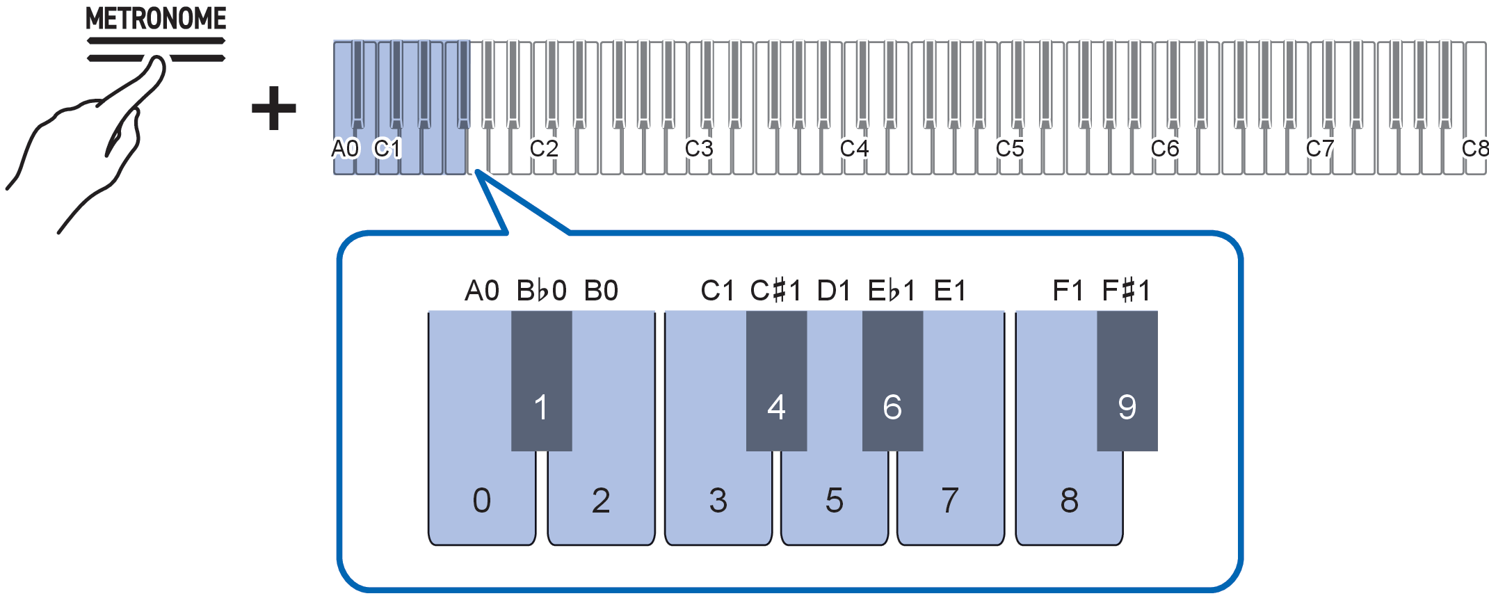 METRONOME düğmesini basılı tutarken, A0 ile F{1 arasında bir tuşa basın (tempo ayarı).