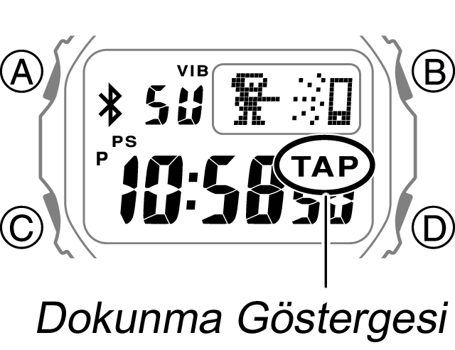 - Saatin ekranına çift dokunarak telefondan gelen sesi durdurmayı sadece Dokunun uyarısı yanıp söndüğünde gerçekleştirebilirsiniz. Dokunun uyarısı yaklaşık 15 saniye boyunca yanıp söner. Yanıp sönen Dokunun uyarısı kaybolduktan sonra sesi durdurmak için telefonda bazı işlemler gerçekleştirin veya yaklaşık bir saniye boyunca D düğmesini basılı tutarak yanıp sönen Dokunun uyarısını etkinleştirin ve ardından saatin ekranına çift dokunun.