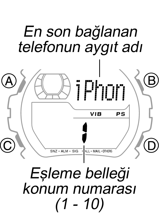 - Saatte Bluetooth simgesi görüntüleniyorsa Saat İşlemleri Moduna girin ve B düğmesini simge kaybolana kadar yaklaşık iki saniye basılı tutun
