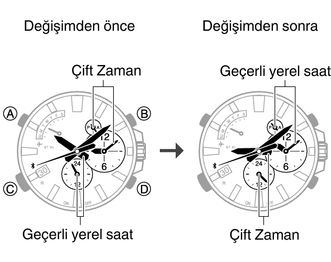 (B) düğmesini yaklaşık üç saniye basılı tutarak geçerli konumunuzdaki saat ile Çift Zamanı değiştirebilirsiniz.