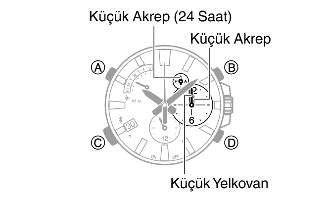 Bu, küçük akrep, küçük yelkovan ve küçük 24 saat kolu hizalamasının ayarlanabilmesini sağlar.