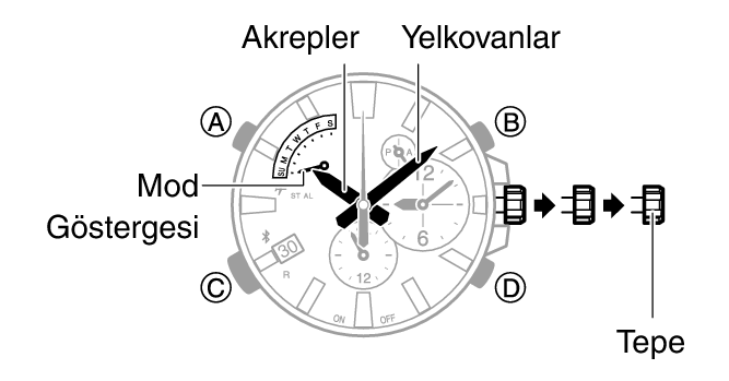Bu, saniye göstergesinin saat 12’ye gitmesine, mod göstergesinin SU konumuna gitmesine ve saat ve yelkovan ayarı işleminin etkinleşmesine neden olur.