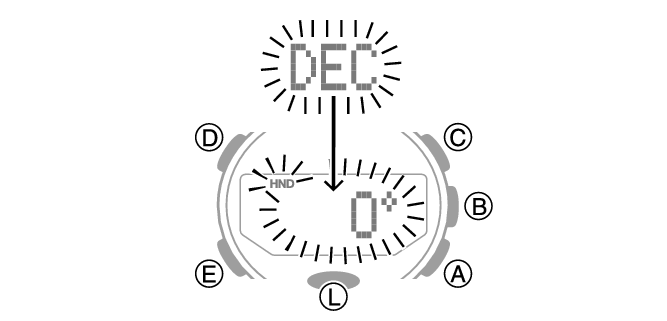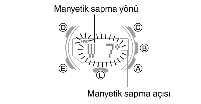 4.Manyetik sapma yönünü ve açısını değiştirmek için (A) (Doğu) ve (C) (Batı) düğmelerini kullanın.