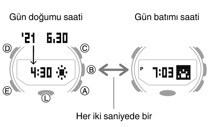 Bu, Yerel Şehrinizde mevcut tarihte ekranda gündoğumu ve günbatımı saatleri arasında iki saniyelik aralıklarla geçiş yapılmasına neden olur.