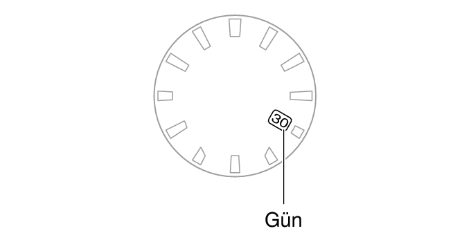 Bu, saniye kolunu saat 12’ye gitmesine ve gün ayarı işleminin etkinleşmesine neden olur. Bu sırada işlev kolu hafifçe hareket eder.
