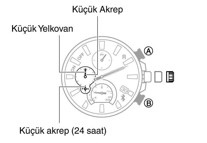Bu, küçük akrep, küçük yelkovan ve küçük 24 saat kolu hizalamasının ayarlanabilmesini sağlar.