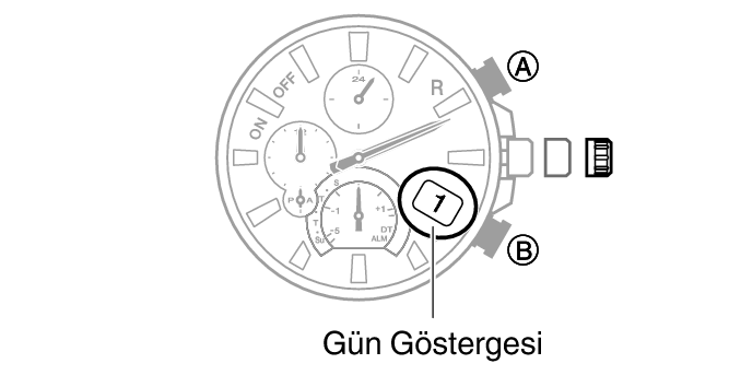 - İşlev kolu ve gün göstergesi istediğiniz konuma geldiğinde bu prosedürün 12. adımına geçin. İstediğiniz ayarları yapamıyorsanız 10. adıma gidin.