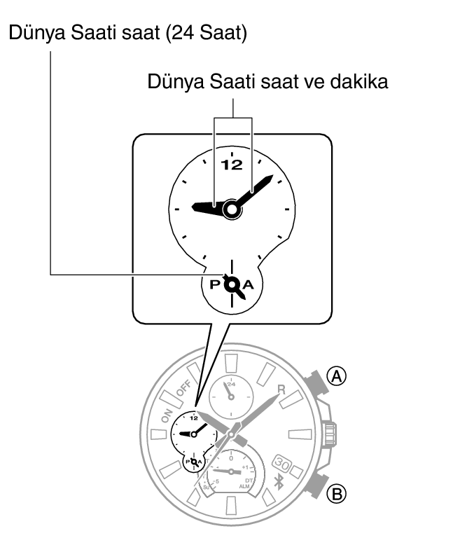 - Küçük akrep (24 saat) konumunu kontrol ederek bir Dünya Saatinin a.m. veya p.m. olduğunu belirleyebilirsiniz.