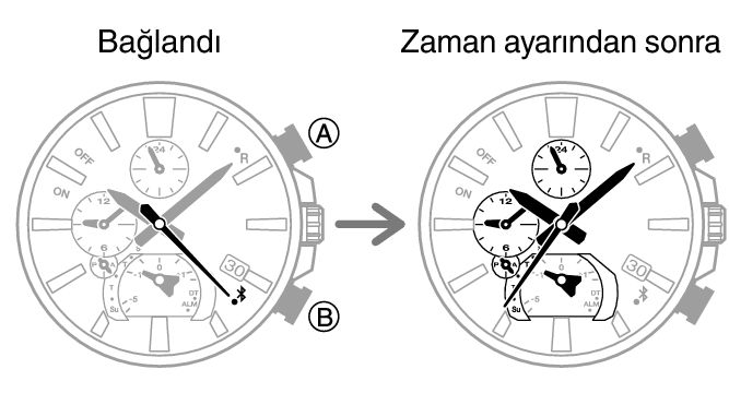 Saniye kolu [R] işaretini gösterene kadar (B) düğmesini en az 0,5 saniye basılı tutun. Saniye kolu [R] işaretini gösterdiğinde düğmeyi bırakın.