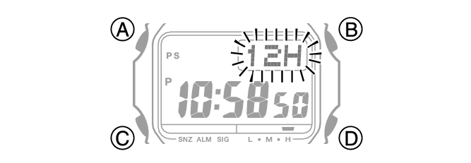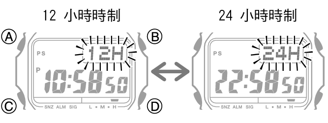 按下(D)即可在 [12H](12 小時時制)和 [24H](24 小時時制)設定之間切換。