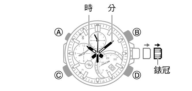 這樣會使秒針移至 12 點鐘,然後您就可以進行小時和分鐘的設定操作。