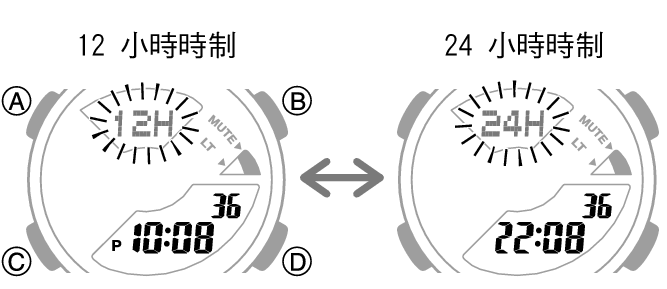 按下 (D) 以選擇 [12H](12 小時時制)或 [24H](24 小時時制)。