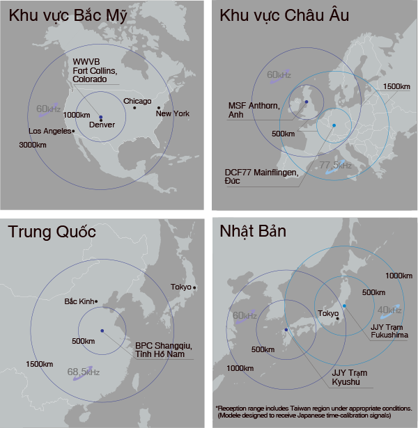 - ● Khi đồng hồ ở khu vực có thể nhận tín hiệu hiệu chuẩn thời gian được hỗ trợ, đồng hồ sẽ tự động thực hiện thao tác nhận tín hiệu hàng đêm.