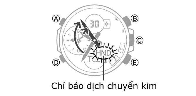 1.Để dịch chuyển kim giờ và kim phút, ấn và giữ (B) khi bạn nhấn (D).