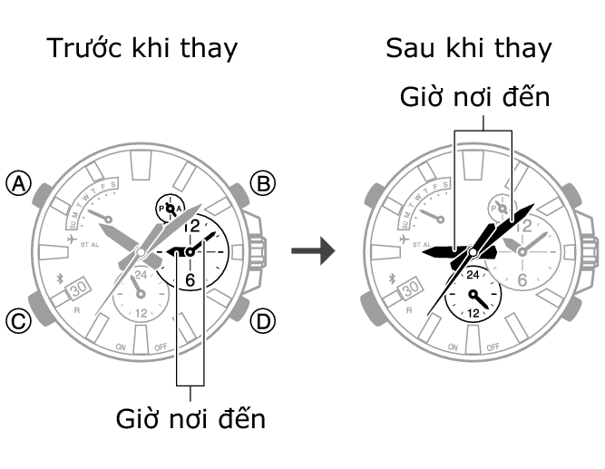 Sử dụng quy trình dưới đây để dễ dàng thay đổi cài đặt ngày và giờ của đồng hồ đến vị trí điểm đến.
