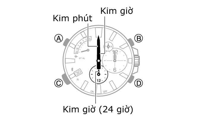 3.Xoay núm vặn để căn chỉnh kim giờ nhỏ, kim phút nhỏ và kim giờ (24 giờ) với vị trí 12 giờ.