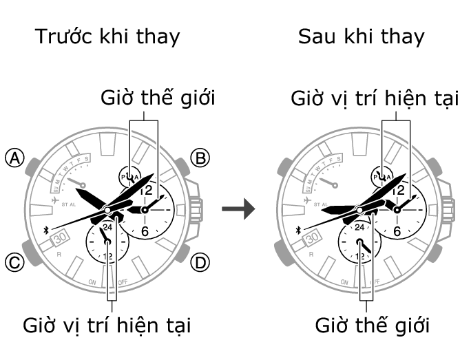 Nhấn giữ (C) khoảng 0,5 giây cho đến khi kim giây chỉ vào R. -