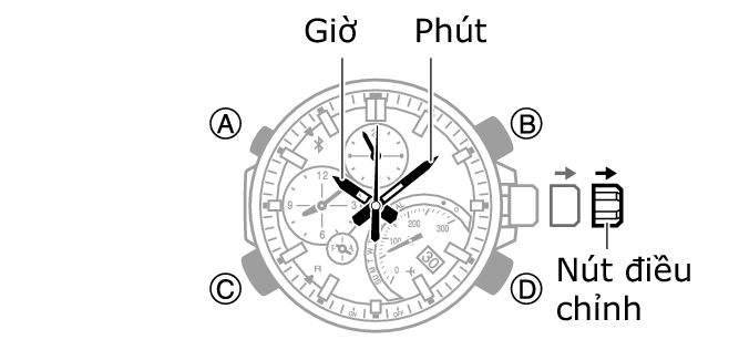Khi đồng hồ đang được kết nối với điện thoại, đồng hồ sẽ tự động điều chỉnh cài đặt ngày và giờ sang cài đặt của điện thoại. Nếu đồng hồ khồng được kết nối với điện thoại, hãy sử dụng quy trình dưới đây để điều chỉnh cài đặt ngày và giờ.