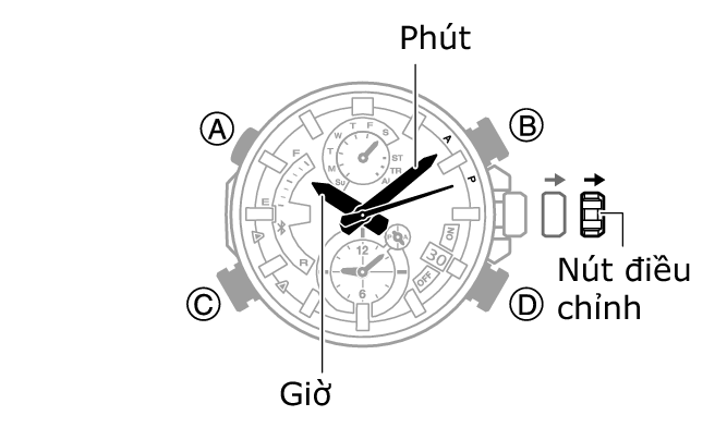 - Thiết đặt Giờ kép cũng thay đổi theo thiết đặt giờ hiện tại. Thao tác nút điều chỉnh sẽ bị vô hiệu hóa khi kim giờ và kim phút của Giờ kép đang chuyển động.