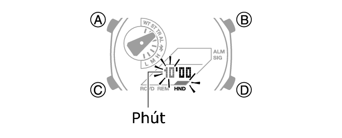 Sử dụng (B) và (D) để thay đổi cài đặt phút.