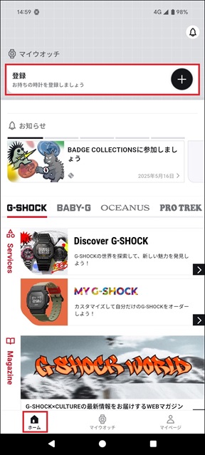 「CASIO WATCHES」アプリのホーム画面にある「+ 登録」ボタンを押して、時計登録をおこないます。